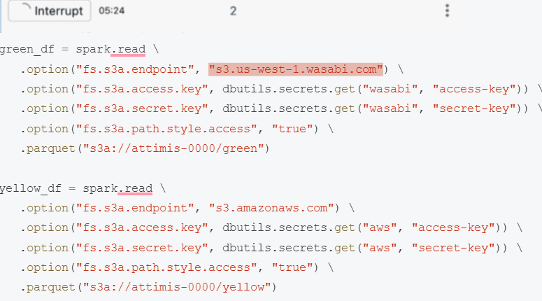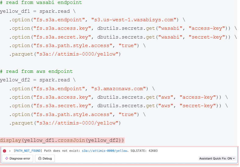 In a scenario, the yellow taxi dataset exists in AWS, but does not exist in Wasabi. The Spark session is configured to use the Wasabi S3 endpoint. The Dataframe then becomes explicitly dependent on the Wasabi endpoint, and when Spark attempts to read the yellow dataset path, it throws an error, even though the data exists in AWS.Because Spark is bound to a single endpoint, it cannot transparently access the AWS copy of the dataset. The failure is not caused by missing data, but by the endpoint dependency introduced by per-bucket configuration.