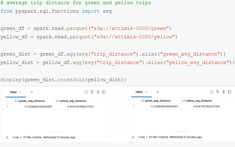 Query Example 2, using the green and yellow public NYC taxi trip data to calculate the average trip distance for each taxi.